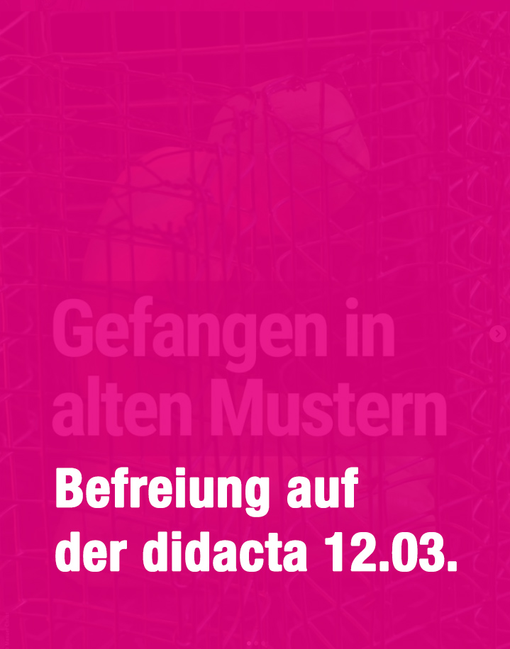 Die KRAFT DES WIR lädt dazu ein in der Halle 7.1 Gang E/037 auf der größten Bildungsmesse im deutschsprachigen Raum, in Köln. Höhepunkt ist die Performance zur BEFREIUNG am Donnerstag, den 12. März um 14 Uhr. Unsere Taschen sind schon gepackt! Wir freuen uns sehr, gemeinsam mit Verbündeten, Mitgliedern der LEA und dem „RealLabor Göttingen“ zur didacta zu reisen.