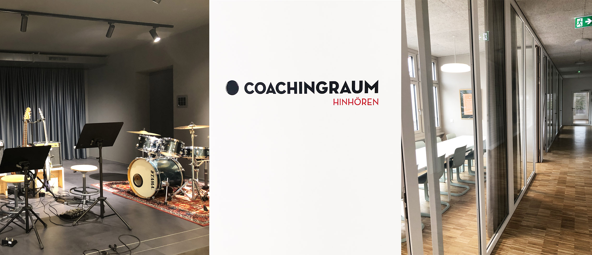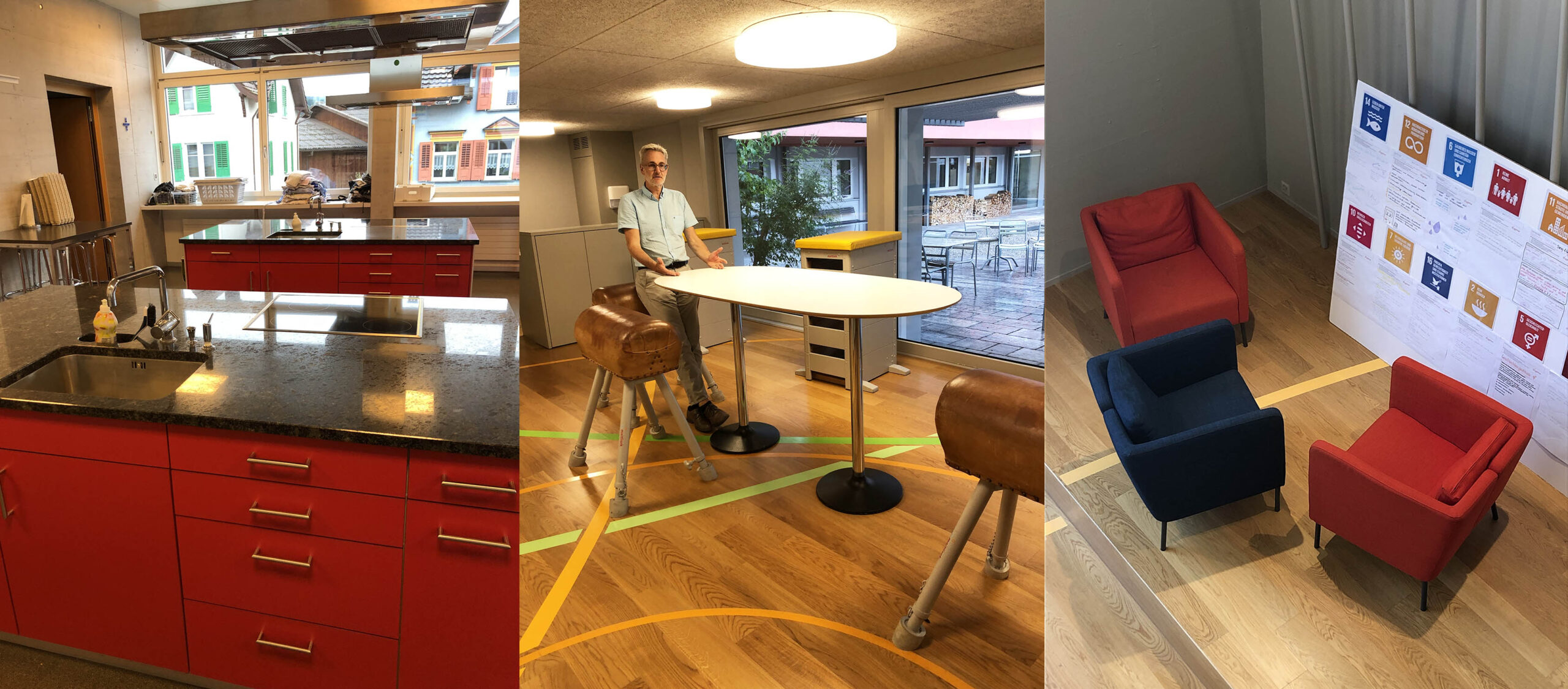 Es geht die Treppen auf und ab. Wir starten auf dem Dorfplatz, mit nachgebauter Bushaltestelle und Bildkulisse von Gassau, und wandeln an den Coaching-Räumen vorüber und sind schon auf dem Weg in den Musikraum. Rasch noch den Klang des Konzertflügels getestet, eröffnet sich hinter der nächsten Tür ein großzügiger Meditationsraum. Das indirekte Licht an der Decke bildet ein Oval. Die Treppen nach oben führen in die Lernlandschaft. Auch hier, wo jeder seinen Schreibtisch hat, wird auf ein ästhetisches Zusammenspiel geachtet.