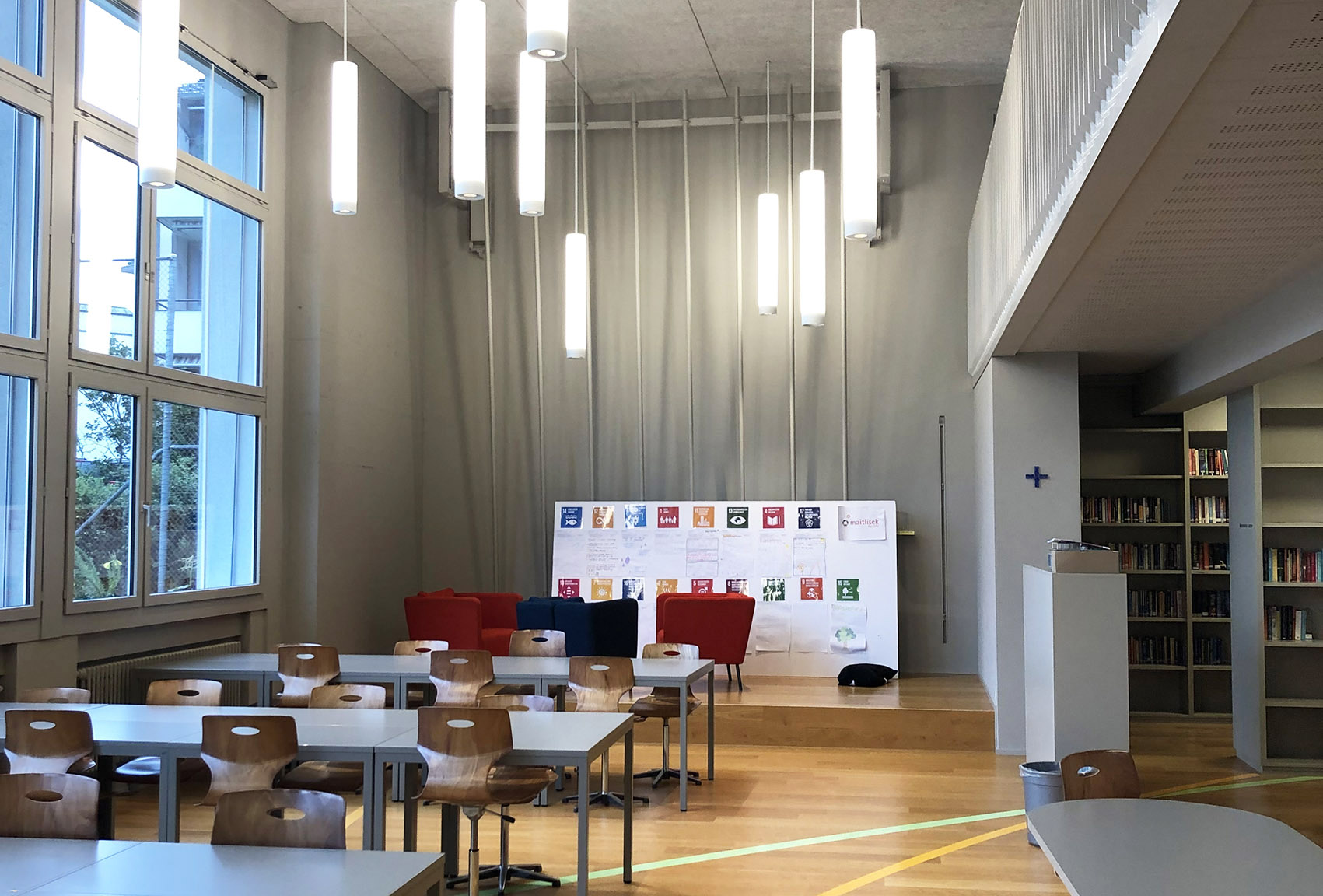 Das ganze Geschehen, die Atmosphäre in der Maitlisek ist nach vorn gerichtet. Alle Räume eröffnen Möglichkeiten – von der Bibliothek, die früher ein Sportsaal war, bis hin zu den Kreativateliers. Auf den Böden in fast allen Räumen sind Impuls-Kreise in unterschiedlichen Farben und Stärken zu sehen. Spannend ist herauszufinden, wo ihre jeweilige Mitte liegt. Kleine, stärkende Botschaften sind an den Fenstern und Türen zu finden. So wird hier das Leitbild, Impulse zu setzen, visuell aufgegriffen. Die durchgängige Ästhetik begeistert.