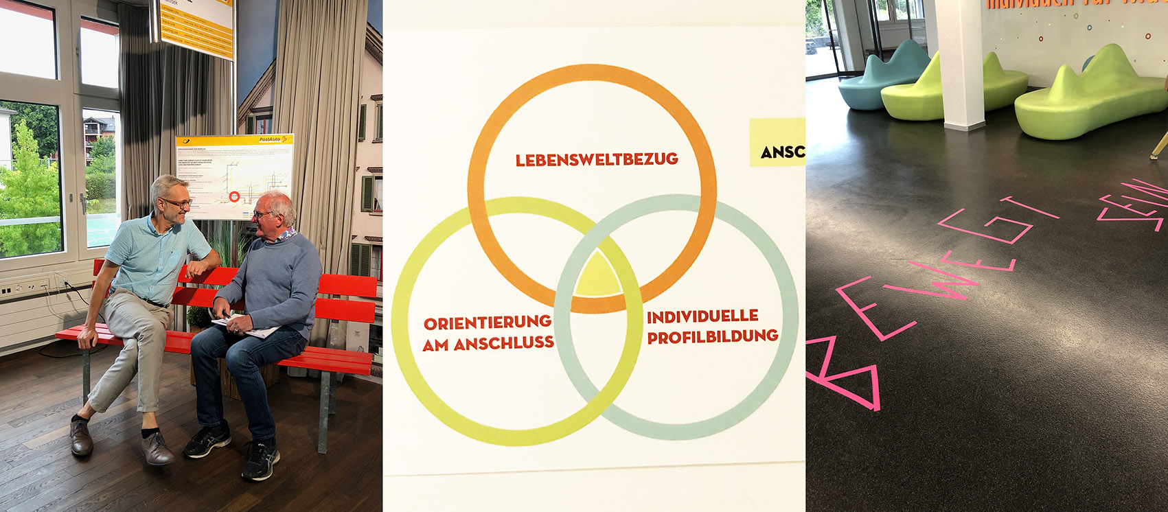 In der Nähe von St. Gallen, in Gossau, eröffnet sich uns eine Lernwelt, die überrascht und vom erlebten Niveau zur Best Practice Liga von Schulen gehört. Wir sind mit Matthias Vogel-Engeli in der Maitlisek verabredet. Von außen könnte das Gebäude eine Schule sein. Hinter der Eingangstür greifen dann keine gängigen Bilder mehr. Eine eindrucksvolle Impulswelt hat sich hier entwickelt, die auf der Idee von Kreisen basiert: Mensch, Raum und Zeit.